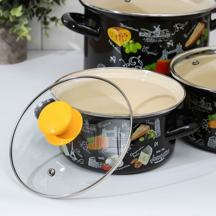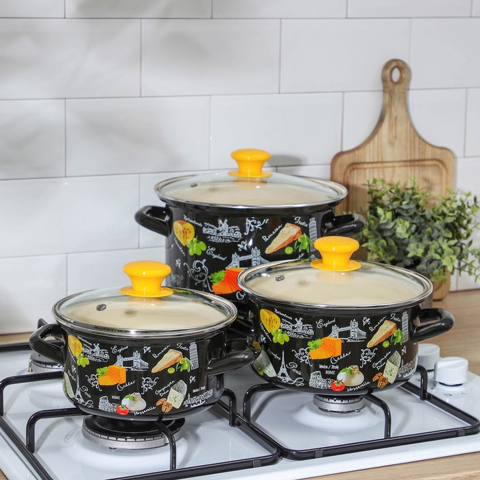 Кастрюли сделаны из качественной стали, покрытой эмалью с декоративным рисунком. Они отлично подходят для приготовления и хранения различных блюд.