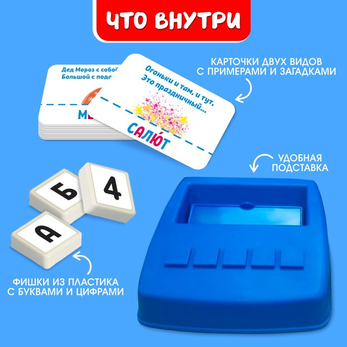 Развивающий набор поможет ребёнку составлять слова и отгадывать новогодние загадки. Игра развивает моторику и мышление.