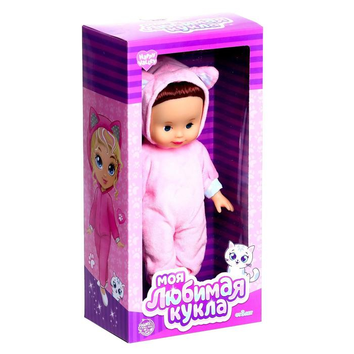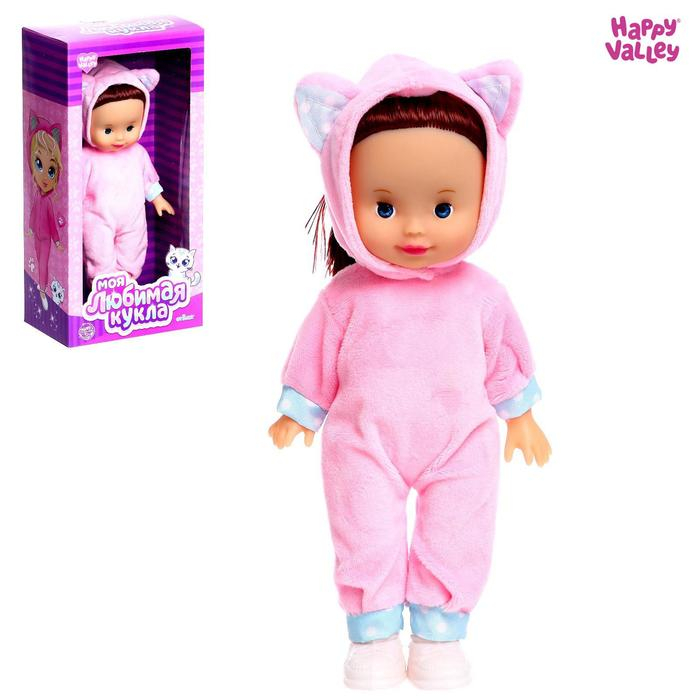 У куклы красивые волосы. Девочка расчешет их и сделает модную укладку. Кукла одета в мягкий костюм кошечки.