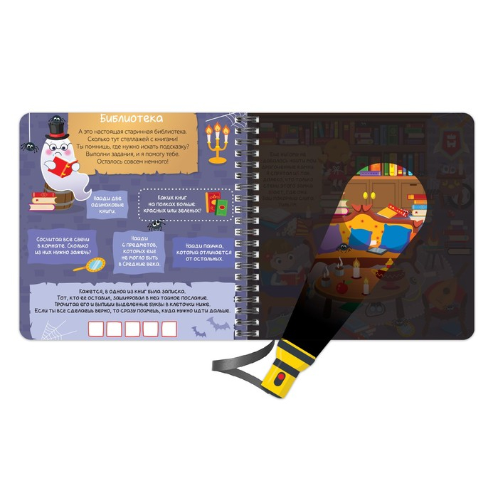 Чтобы отыскать спрятанные сокровища, вам понадобится фонарик. Он выполнен из картона и привязан к книжке на шнурок.