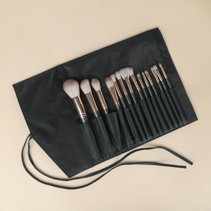 Набор кистей для макияжа «Lillian», 14 предметов, футляр на завязках, цвет зелёный/серый