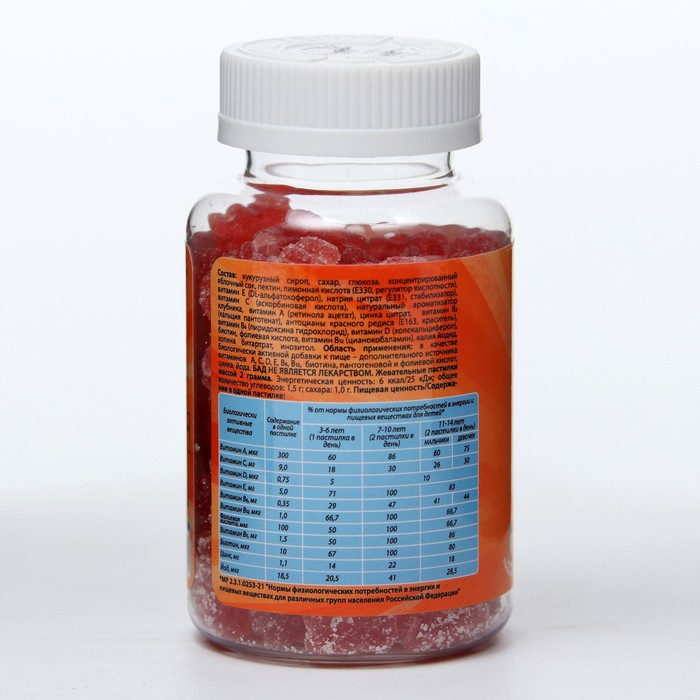 Состав: кукурузный сироп, сахар, глюкоза, концентрированный яблочный сок, пектин, лимонная кислота (E330, 330, регулятор кислотности), витамин E (DL-альфатокоферол), натрия цитрат (E331 стабилизатор), витамин C (аскорбиновая кислота), натуральный ароматизатор клубника, витамин А (ретинола ацетат), цинка цитрат, витамин B (кальция пантотенат), антоцианы красного редиса (E163, краситель), витамин В6 (пиридоксина гидрохлорид), витамин D (холекальциферол), биотин, фолиевая кислота, витамин B12 (цианокобаламин), калия йодид, холина битартрат, инозитол.