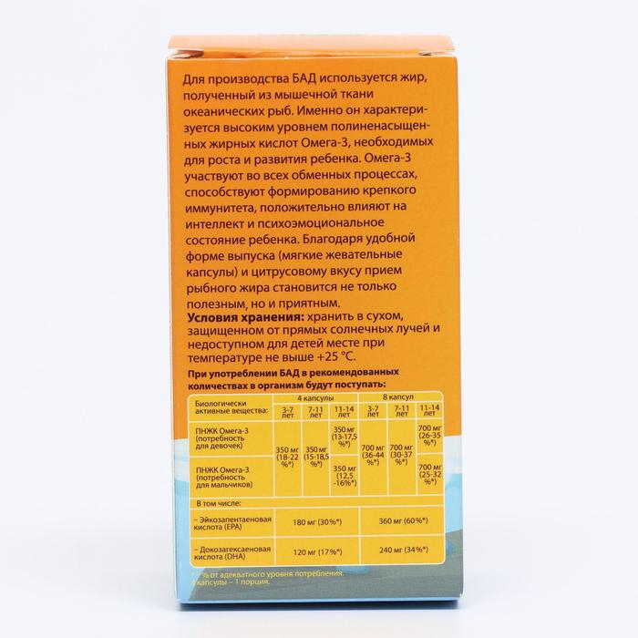 Детский рыбный жир получают из мышц и подкожного жира океанических рыб. По сравнению с рыбьим, рыбный жир содержит большее количество полиненасыщенных жирных кислот (ПНЖК), необходимых для роста и развития ребенка. Омега-3 участвуют во всех обменных процессах, способствуют формированию крепкого иммунитета, положительно влияют на интеллект и психоэмоциональное состояние ребенка. Благодаря мягким жевательным капсулам и фруктово-ягодному вкусу прием рыбного жира становится не только полезным, но и приятным.