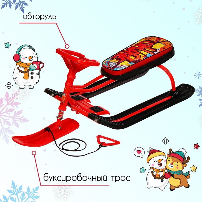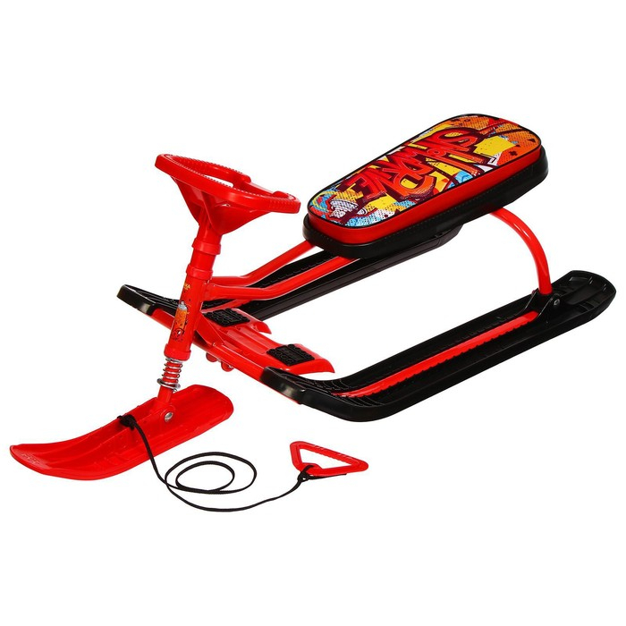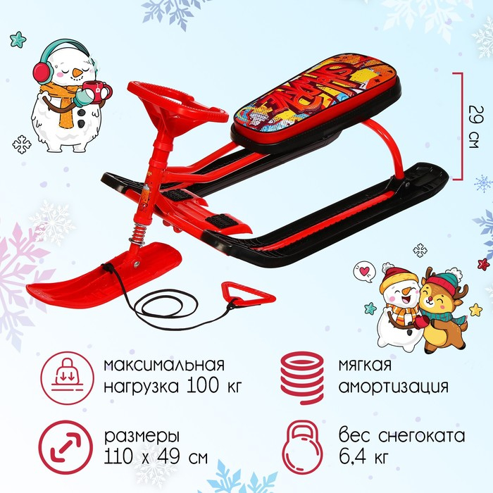 Снегокат предназначен для перевозки детей по плотному снегу или льду, катанию с горок. Имеет сварную конструкцию из стальных труб, пластиковых элементов и мягкое сиденье, обтянутое искусственной кожей с рисунком. Оснащён буксировочным тросом. Усиленный тормоз эффективен на обледенелой поверхности. В комплект входит набор наклеек на снегокат.