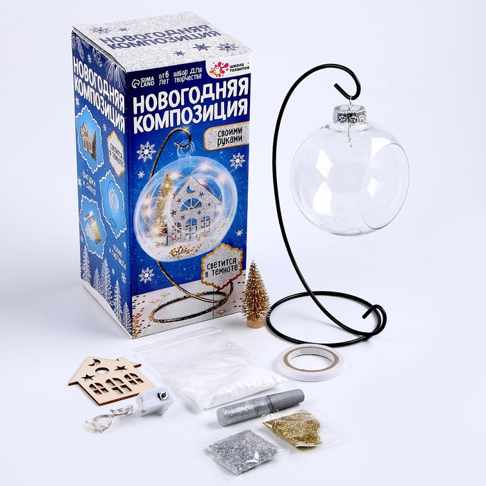 В наборе: металлическая подставка, шар-основа, деревянная фигурка, клей, двусторонняя клейкая лента, блёстки, декор, светящаяся гирлянда.