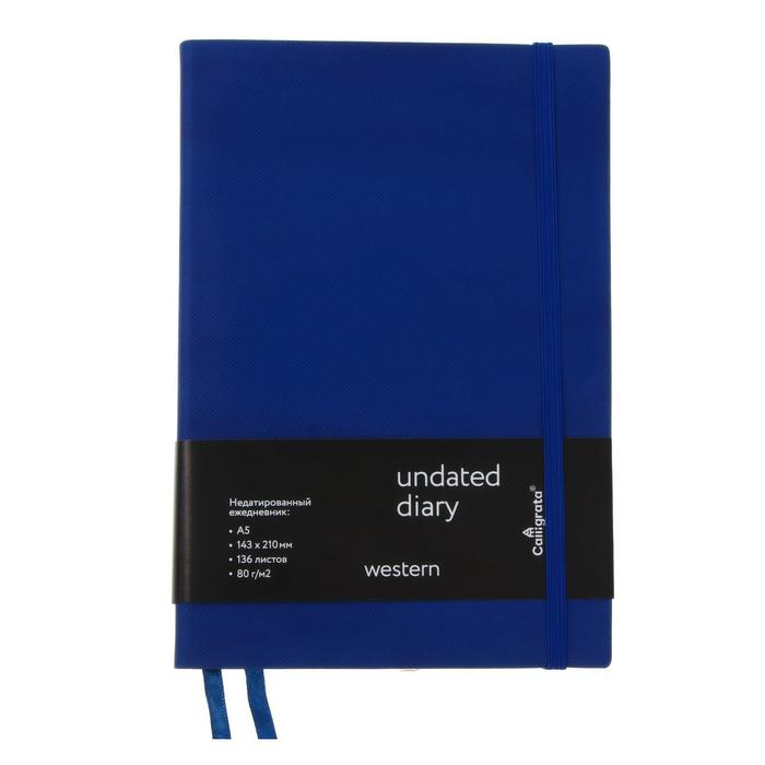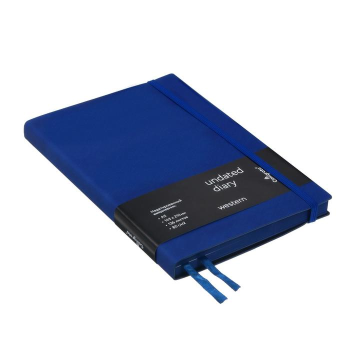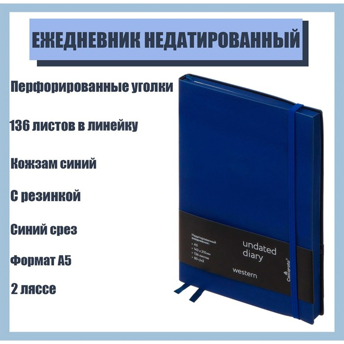Ежедневник недатированный Western A5, 136 листов в линейку, кожзам, синий, синий срез, с резинкой, 2 ляссе, перфорированные уголки