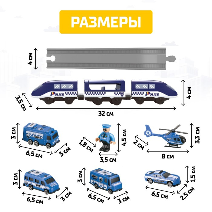 Железная дорога «Экспресс» поможет ребёнку почувствовать себя машинистом настоящего полицейского локомотива! Дополнительные машинки и вертолёт в наборе придут на помощь составу и помогут догнать преступников на земле и в небе. Дополнительные элементы в виде моста и туннеля сделают игру реалистичной и интересной. Это не просто игрушка, а уменьшенный прототип реального поезда, который представляет собой железнодорожный состав с несколькими вагонами.