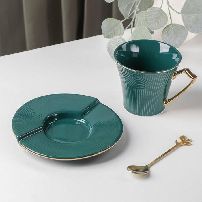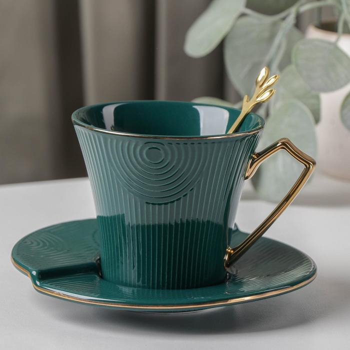 Чайная пара керамическая «Элизабет», 3 предмета: чашка 240 мл, блюдце d=13,5 см, ложка, цвет зелёный