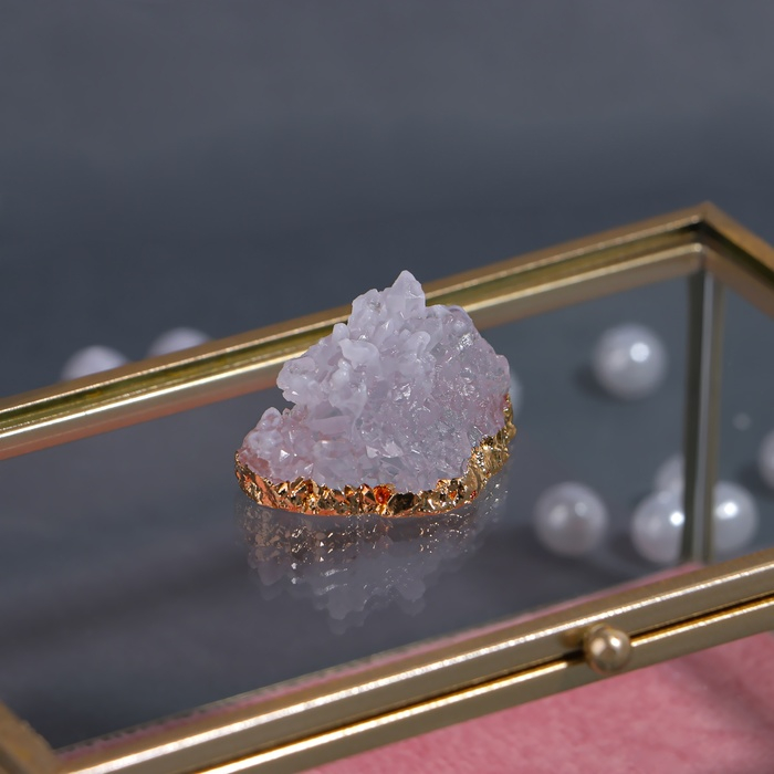 Ящичек оснащён откидной крышкой, защищающей содержимое от пыли и других внешних факторов. Украшен декоративной ручкой-камнем. Прочное стекло позволяет видеть, что хранится внутри, и не тратить время на поиски. Ножки не дают металлическим элементам повреждать поверхность, на которой стоит органайзер.