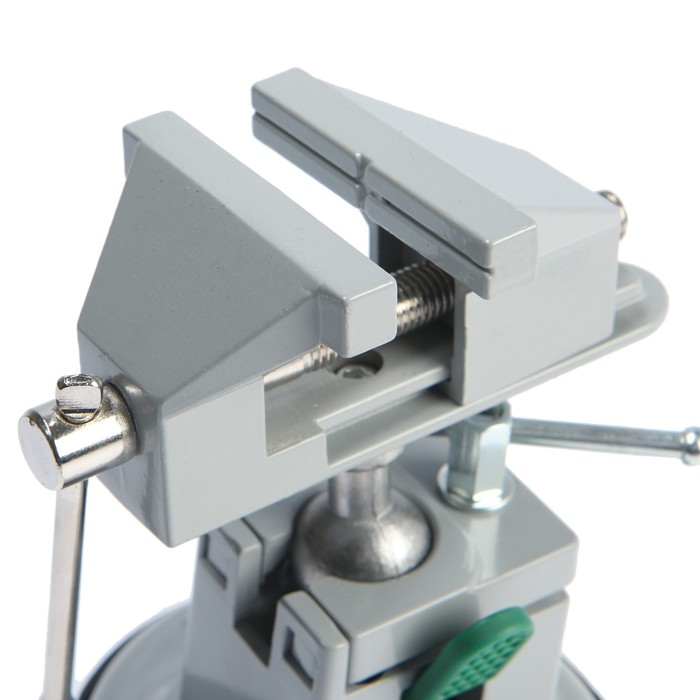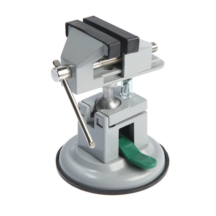 Модель изготовлена из алюминиевого сплава. Тиски оснащены резиновой вакуумной присоской в нижней базовой части, позволяющей крепить тиски к любым ровным поверхностям, а также шарнирным механизмом, что позволяет вращать и фиксировать рабочую верхнюю часть инструмента под нужным углом.