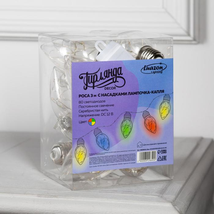 Гирлянда «Нить» 3 м с насадками «Лампочки капля», IP20, прозрачная нить, 80 LED, свечение мульти, 8 режимов, 220 В