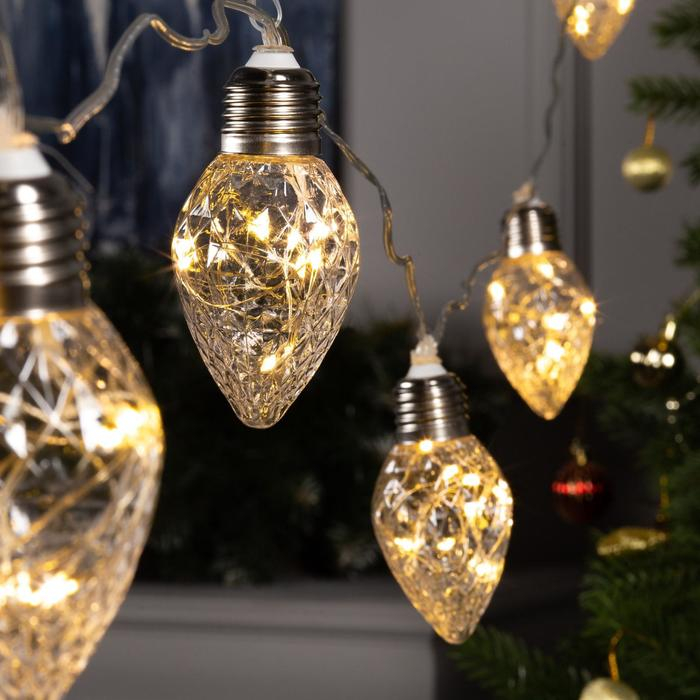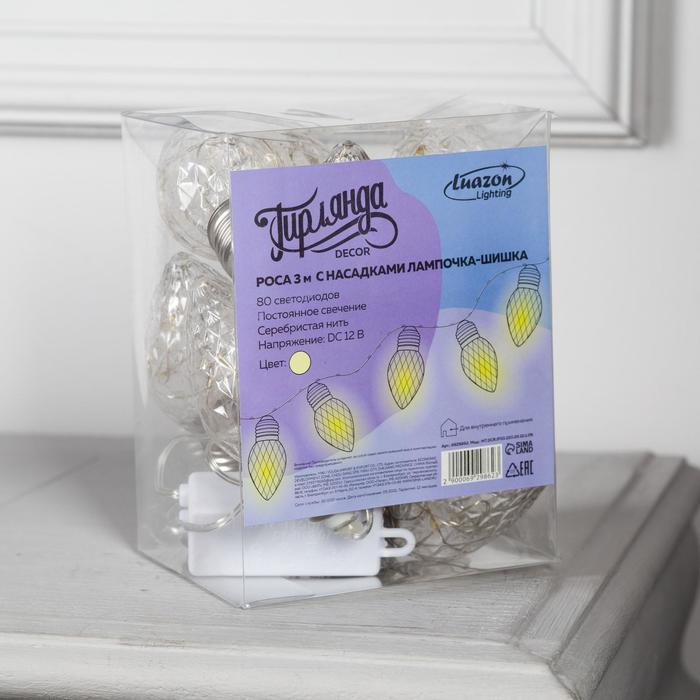 Гирлянда «Нить» 3 м с насадками «Лампочки шишки», IP20, прозрачная нить, 80 LED, свечение тёплое белое, 8 режимов, 220 В