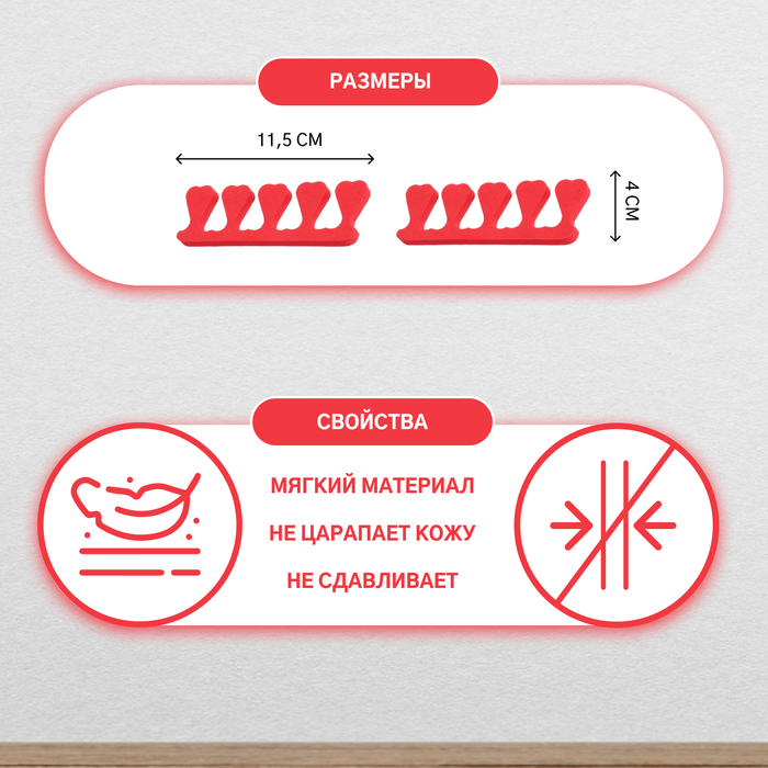 Разделители пальцев ног — это необходимый аксессуар для хорошего и качественного педикюра. Обеспечивают чёткую фиксацию пальцев, надёжно защищают наносимое лаковое покрытие или рисунок на ногтях от смазывания, облегчают сушку. Материал: полиэтилентерефталат.