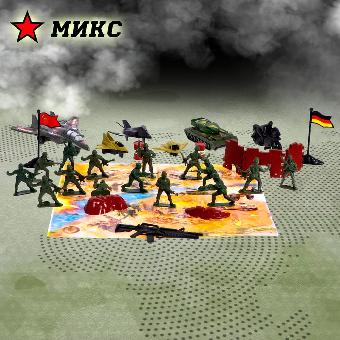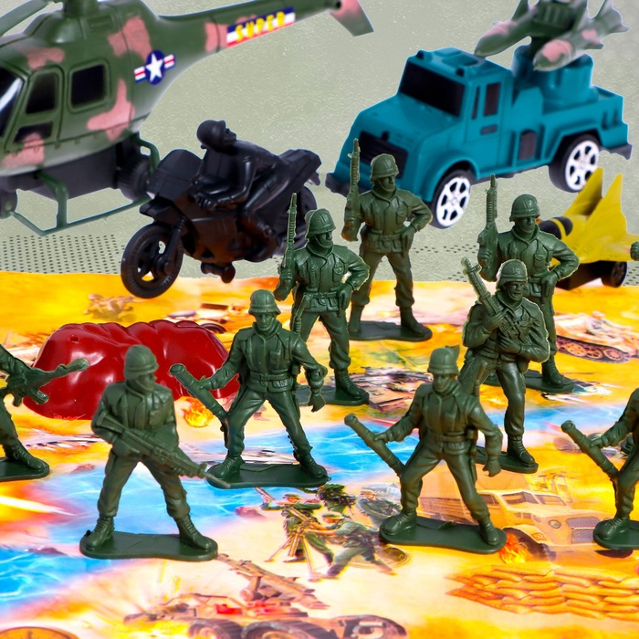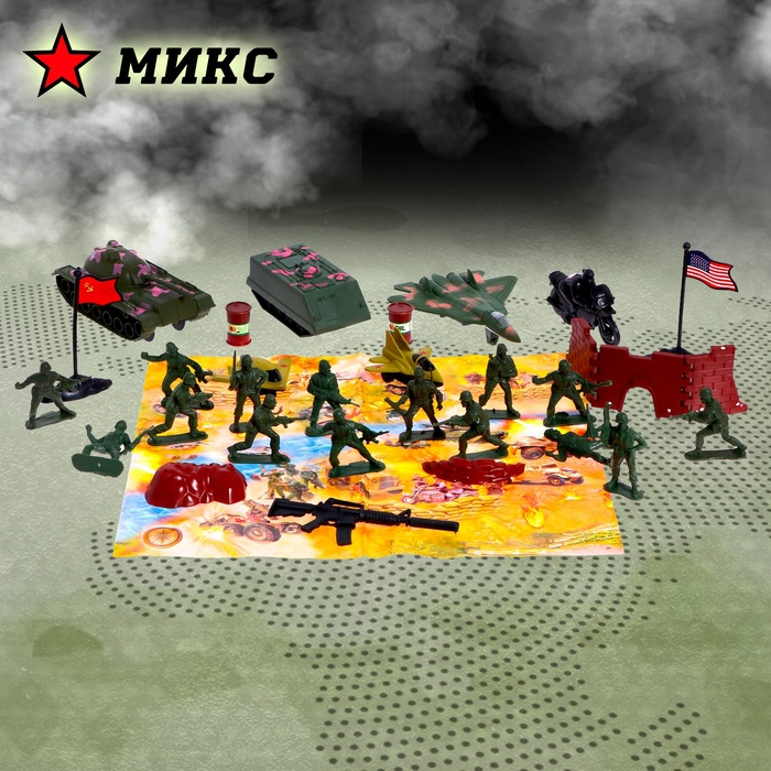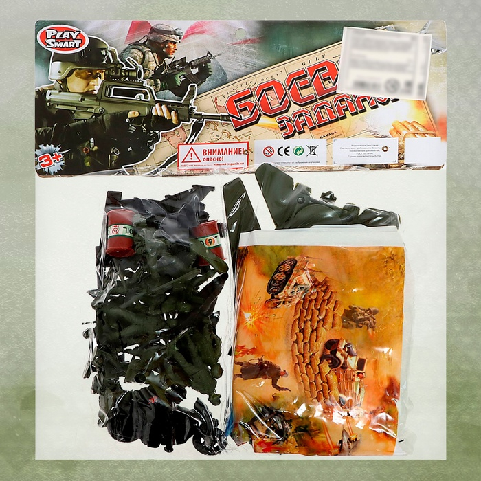 Набор солдатиков «Боевое задание» — зелёные игрушечные солдаты с боевой техникой и аксессуарами! Атмосфера настоящего боевого задания — флаг, бочки, стена, мешки с песком — всё воплощено с учётом мельчайших деталей.
