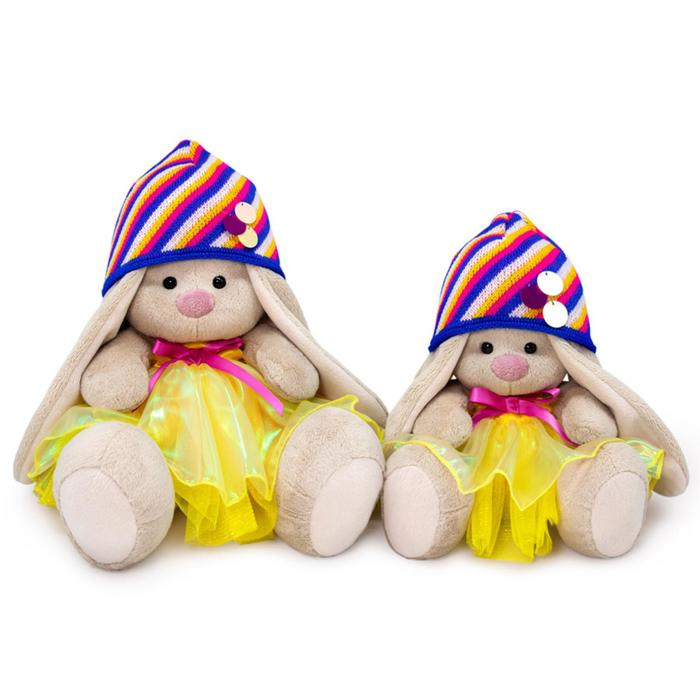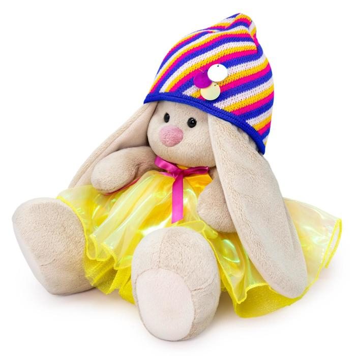 - На зайке платье цвета лимонада, сшитое из тканей компаньонов и украшено розовым бантиком. Также в комплекте необычная вязаная шапочка, связанная диагональными яркими полосами из мягкого акрила. Шапочка украшена крупными блестящими пайетками.