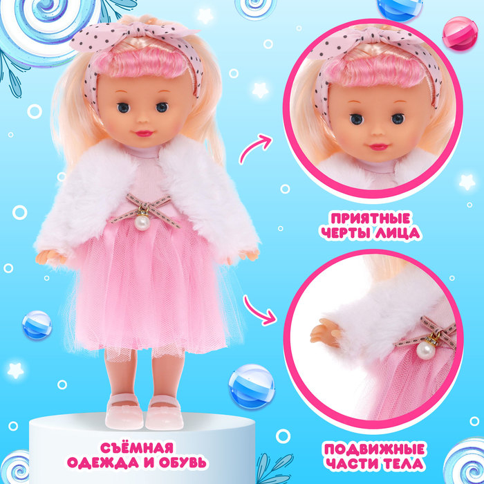 У куклы красивые длинные волосы. Малышка расчешет их и сделает модную укладку. Кукла одета в нарядное платье, шубку, ботиночки, есть аксессуары.