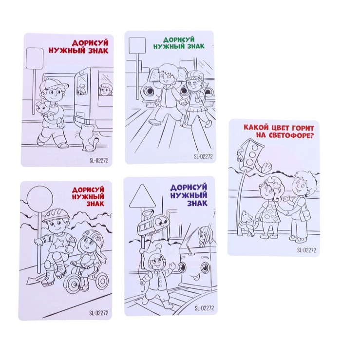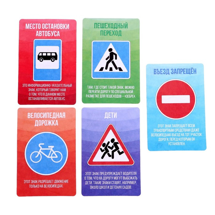 - В комплект входят 5 обучающих карточек с заданиями, которые помогут объяснить значения некоторых дорожных знаков.