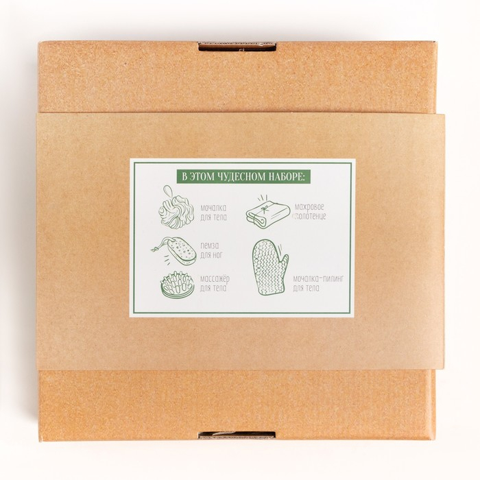 В состав набора входят: Варежка-мочалка, Массажёр, Мочалка, Пемза, Полотенце