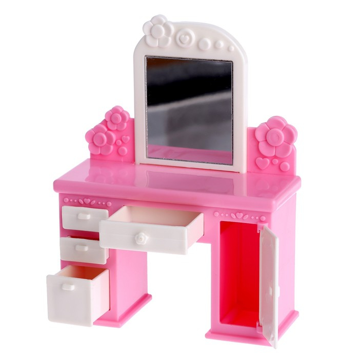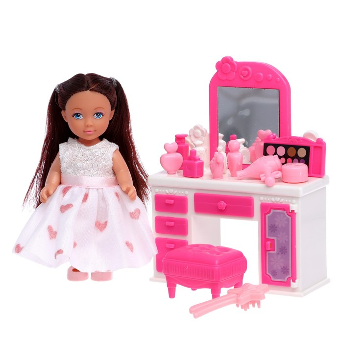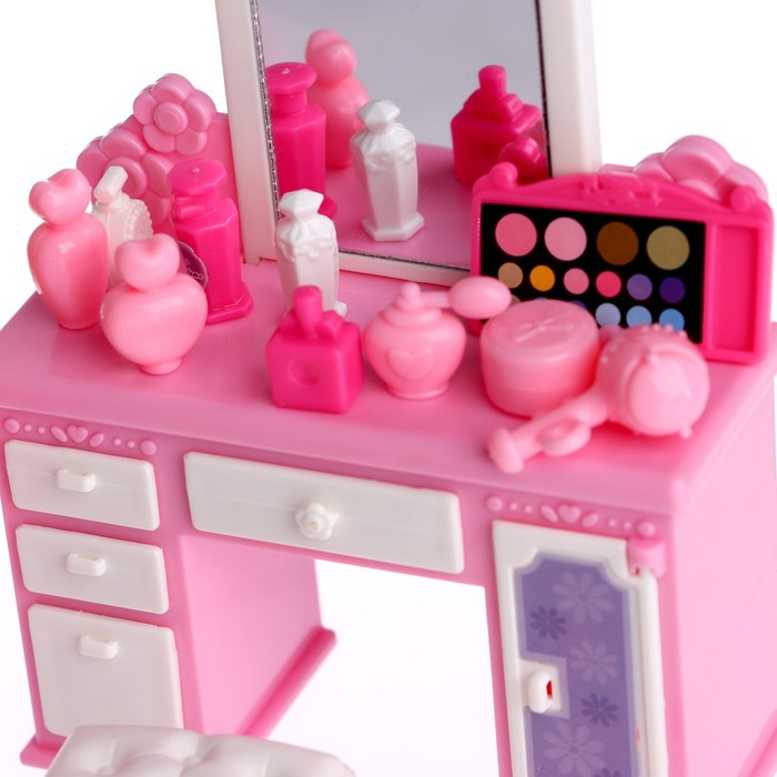 В комплекте уголок красоты. Он включает трельяж с зеркалом, стульчик, косметика, расчёска, фен.