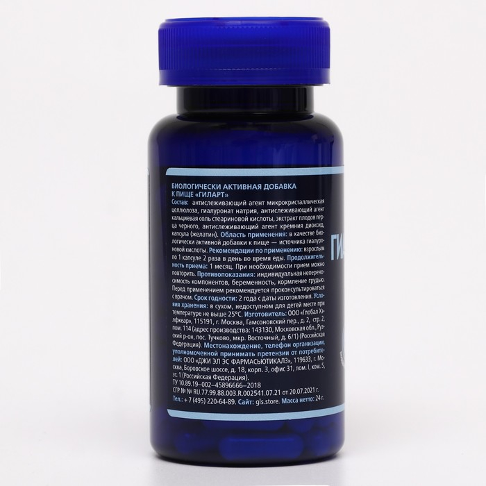 Состав: 2 капсулы (суточная дозировка) содержат: гиалуронат натрия — 120 мг, в том числе гиалуроновой кислоты — 57 мг.
