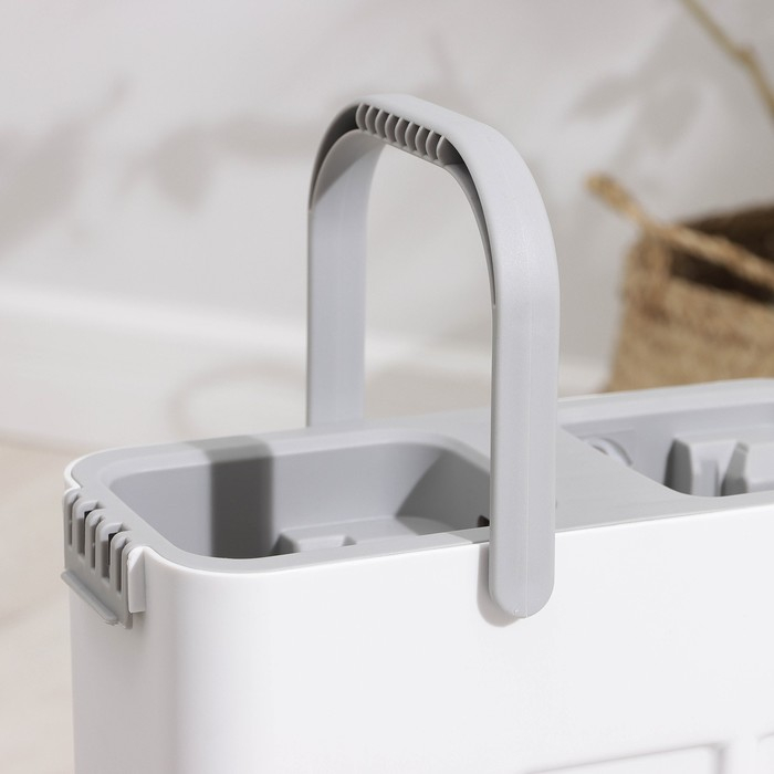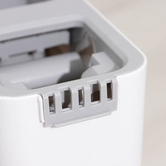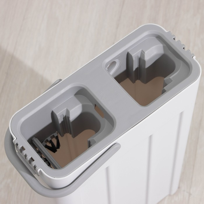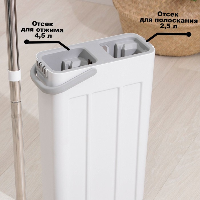 Ведро с двумя отсеками. Отсек для полоскания с щёточками, который при минимальных усилиях позволяет быстро и эффективно очистить насадку. Второй отсек с роликом для вертикального отжима.