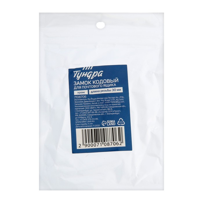 Замок кодовый ТУНДРА, для почтового ящика, цвет хром, длина резьбовой части 30 мм