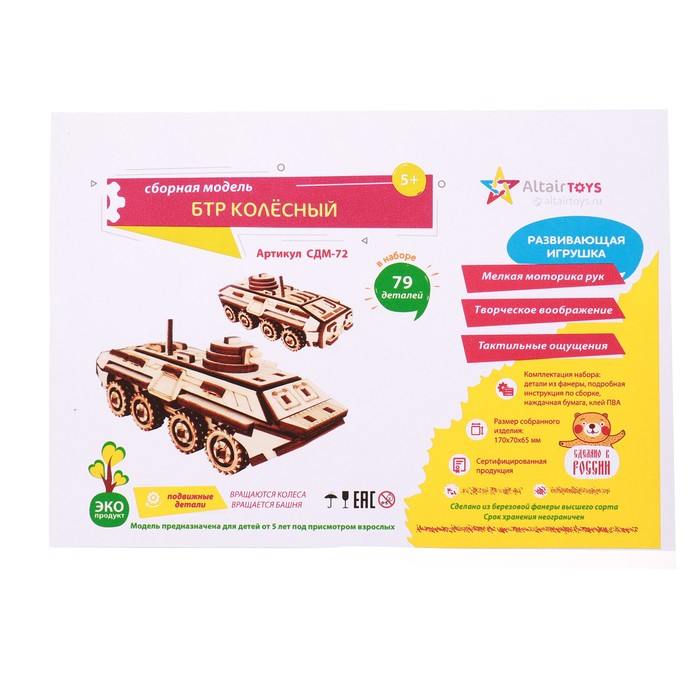 Сборная модель БТР-80 — отличный вариант досуга, который разовьёт у ребёнка множество навыков. Склеивайте детали между собой согласно инструкции. При желании раскрасьте игрушку и покройте лаком. После сборки и высыхания клея моделью можно играть.
