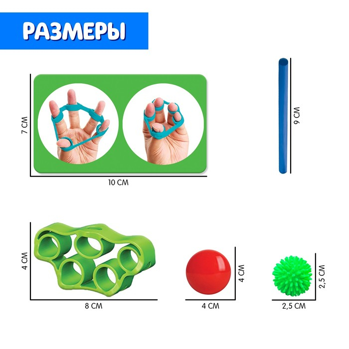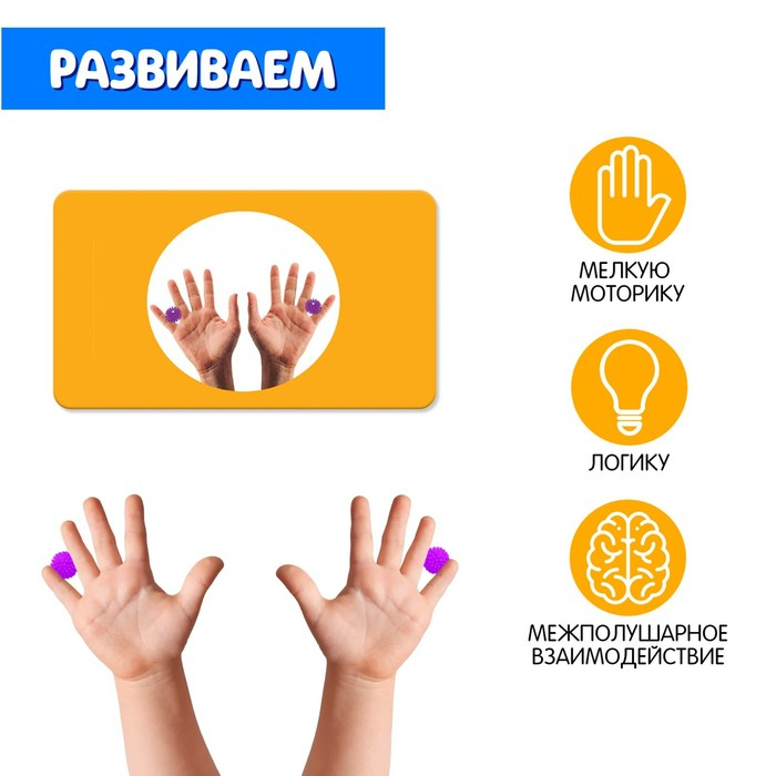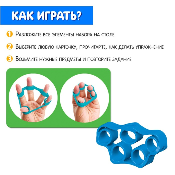 В наборе вы найдёте тренажёр, 10 упражнений на карточках, 8 тактильных шариков, 1 гладкий мячик, 1 палочку.