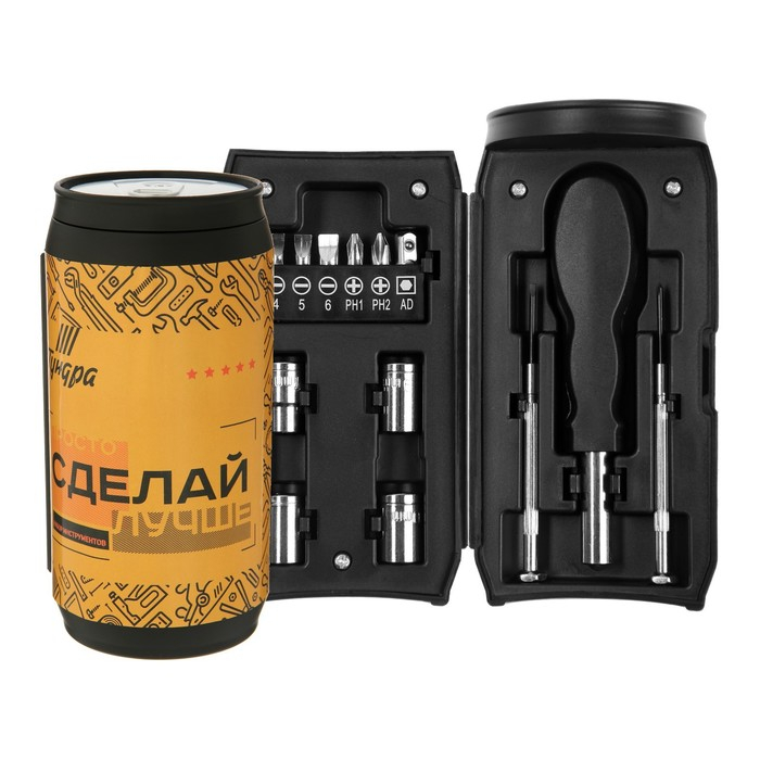Подарочный бокс в виде банки, как из-под газированного напитка выполнен из ударопрочного пластика. Данный набор станет отличным подарком как для домашних мастеров, так и для профессионалов.