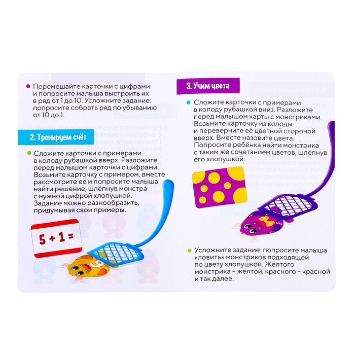 - В наборе малыш найдёт карточки с изображением забавных монстров, 10 карточек с увлекательными заданиями и 4 яркие хлопушки.