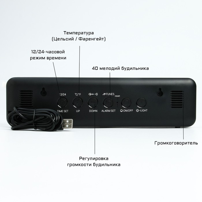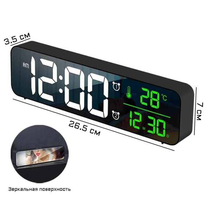Часы электронные с будильником, календарём, термометром представлены в современном дизайне, они отлично впишутся в ваш интерьер. Интерьерные часы станут прекрасным декором для дома и дачи, их можно поставить как на прикроватную тумбочку в спальне, детской комнате, гостиной так и на стол или на комод в зале, холле или на кухне. Будильник настольный имеет кварцевый механизм, который гарантирует высокую точно хода. Часы настольные обладают громким будильником, ребенку и вам будет комфортно просыпаться, на работу и в школу. Будильник на батарейках не требует частой замены батареек благодаря экономичному механизму.