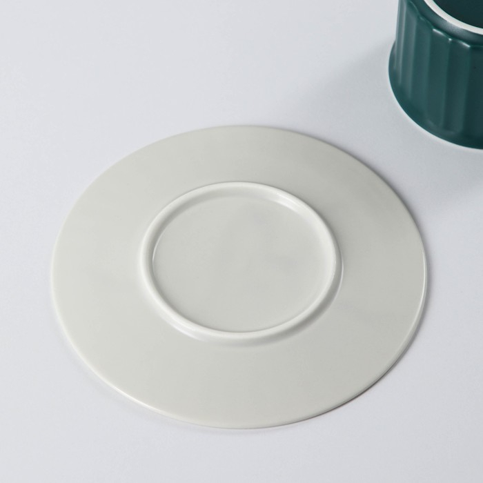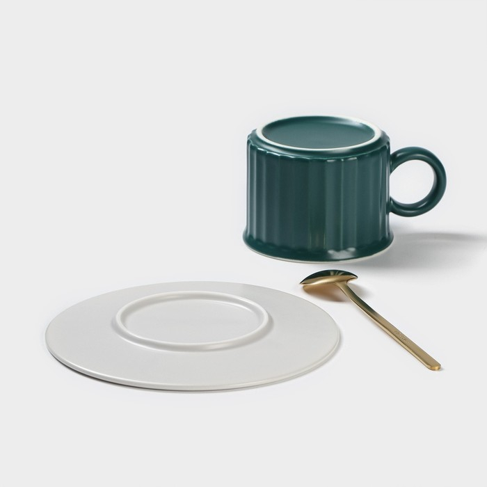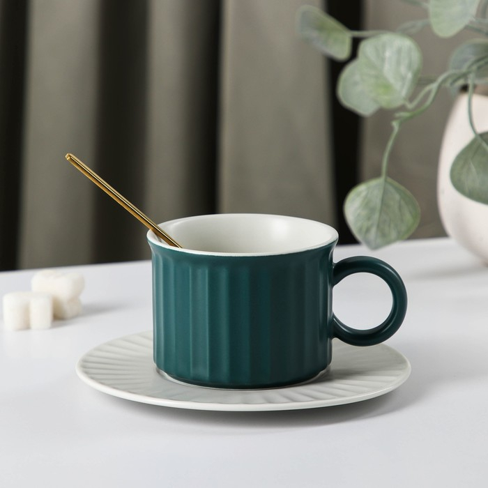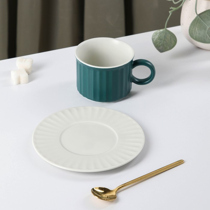 Чайная пара керамическая «Профитроль», 3 предмета: чашка 180 мл, блюдце d=13,7 см, ложка, цвет зелёный/белый
