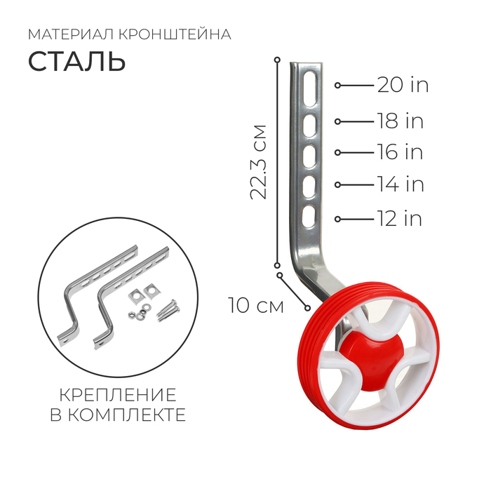 Дополнительные колёса помогают ребёнку на начальных этапах обучения езде на велосипеде. Универсальный кронштейн позволяет использовать их на байках с диаметром колёс 12-20 дюймов, в том числе на моделях с задним переключателем.