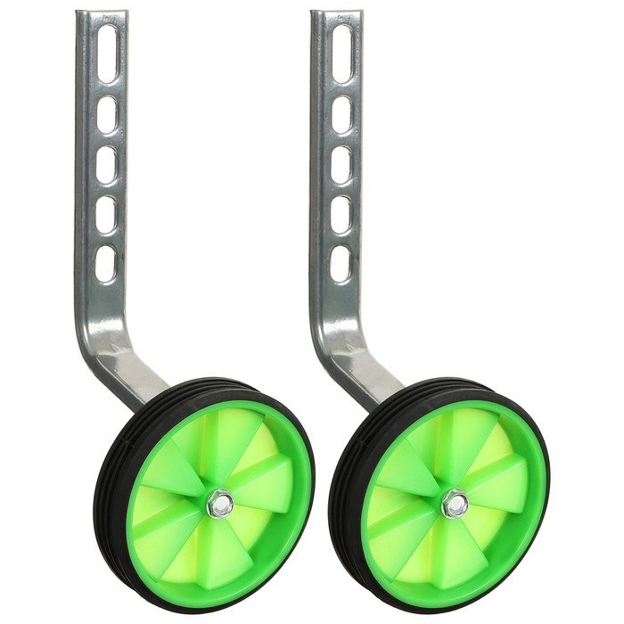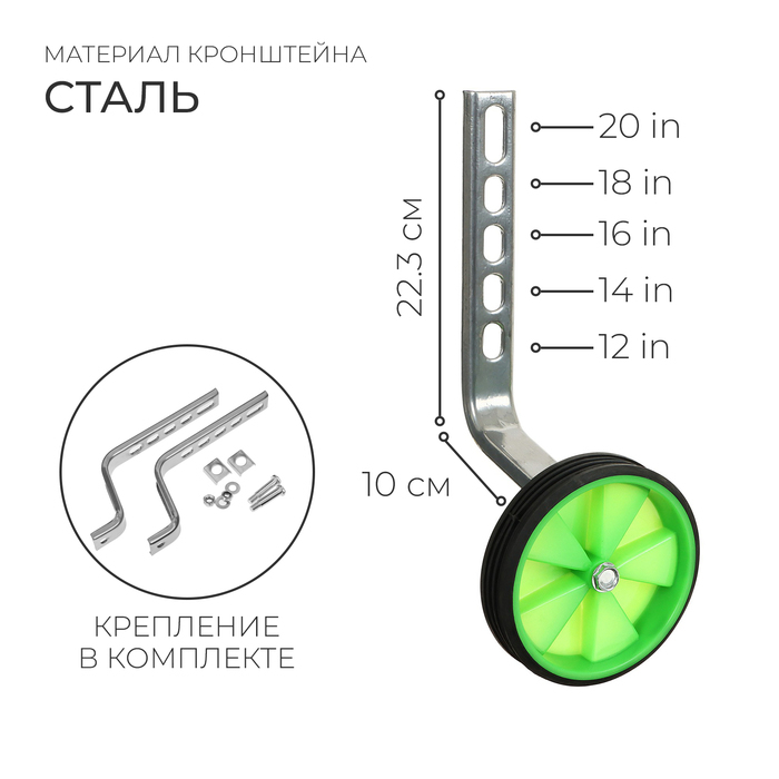 Дополнительные колёса помогают ребёнку на начальных этапах обучения езде на велосипеде. Универсальный кронштейн позволяет использовать их на байках с диаметром колёс 12-20 дюймов, в том числе на моделях с задним переключателем.