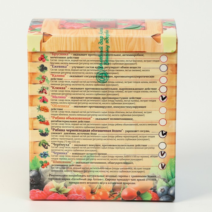Набор состоит из четырех ягодных сиропов - «Малина», «Рябина черноплодная», «Черника» и «Шиповник». Все сиропы приготовлены на основе натурального сырья и имеют насыщенный ягодный вкус. Содержат большое количество витаминов и обладают рядом полезных свойств помогающих укрепить здоровье человека. Набор послужит отличным подарком, поможет разнообразить семейный рацион и порадует великолепной гаммой разных вкусов.