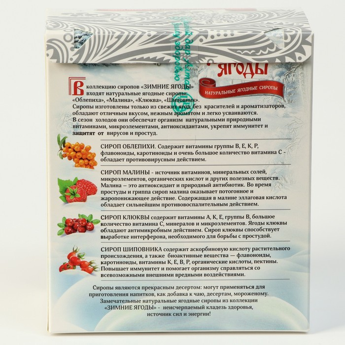 Ягодные сиропы Зимние ягоды это натуральные продукты для здоровья из спелых дикорастущих ягод, собранных в экологически чистых районах Алтая. Натуральные ягодные сиропы это оригинальный неповторимый вкус и аромат в сочетании с уникальными лечебными свойствами, без красителей и ароматизаторов. Благодаря высокому содержанию ценных природных веществ, витаминов и микроэлементов, ягодные сиропы оказывают выраженное оздоравливающее действие на организм человека: укрепляют иммунитет, витаминизируют, повышают работоспособность, заряжают энергией и силой. Используйте натуральные ягодные сиропы, для приготовления морсов, коктейлей, как добавку в чай, кофе и другие напитки, а также к десертам, йогуртам, мороженому, кондитерским изделиям.