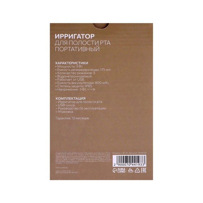Ирригатор для полости рта Luazon LIR-02, портативный, 200 мл, 3 режима, 1 насадка, от USB