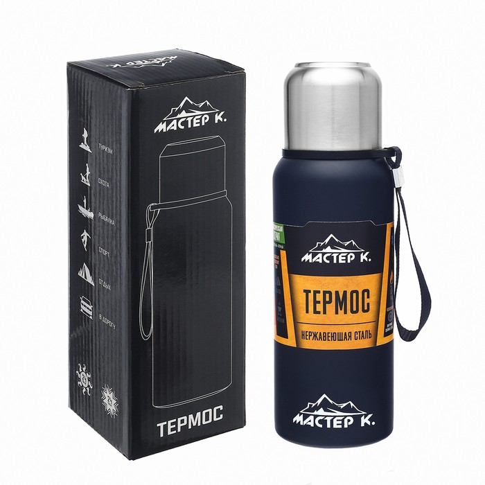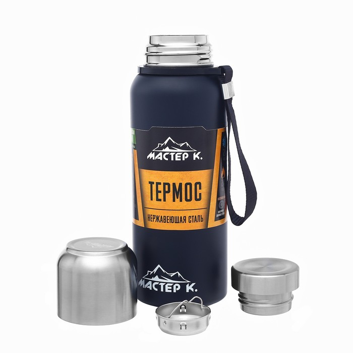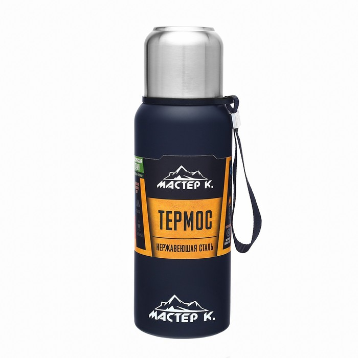 Термос, 600 мл, Путешествие "Мастер К.", с кружкой, сохраняет тепло 24 ч, темно-синий