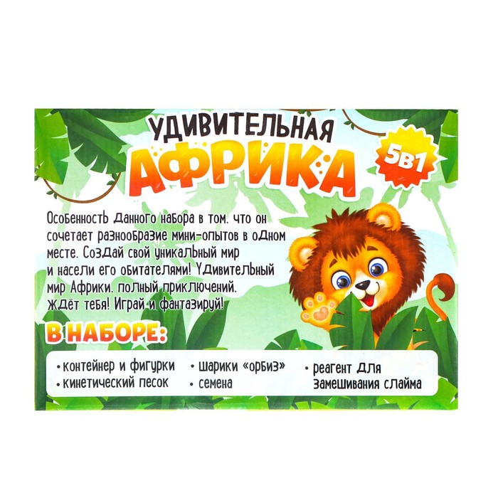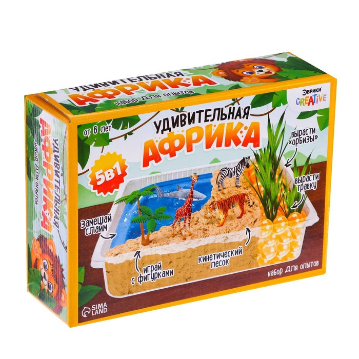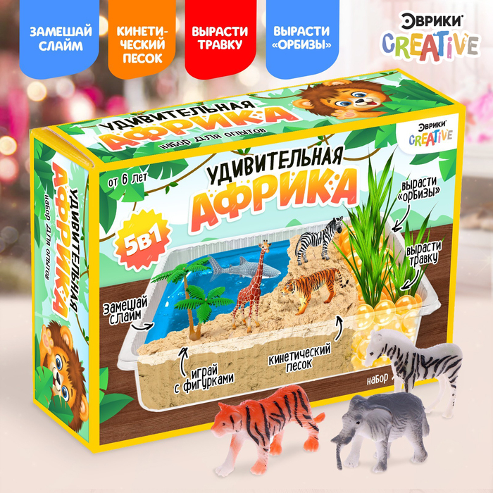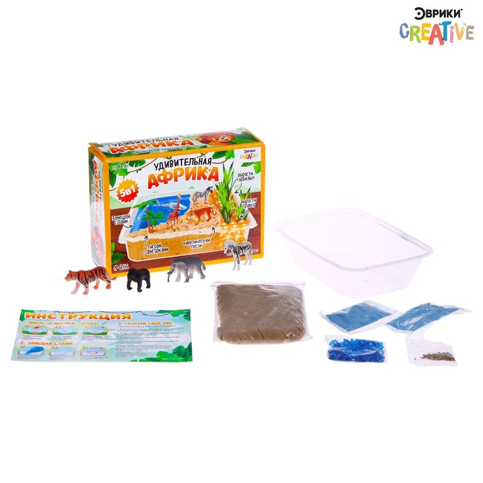 Набор «Удивительная Африка» это 5 разнообразных мини-опытов в одном комплекте. Ребёнок создаст свой волшебный мир и населит его жителями саванны.