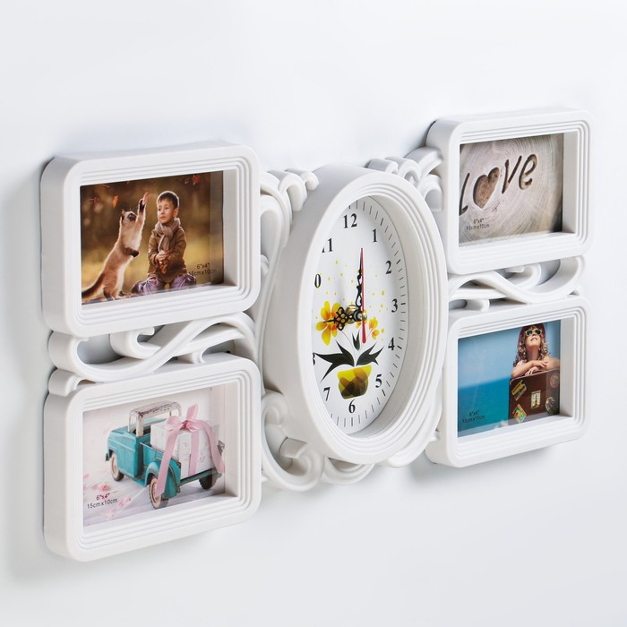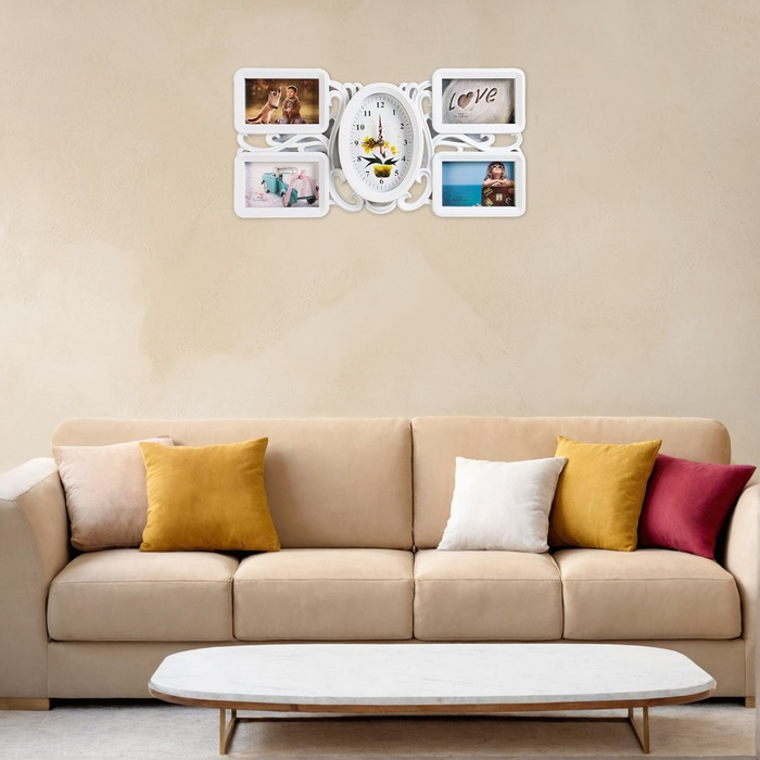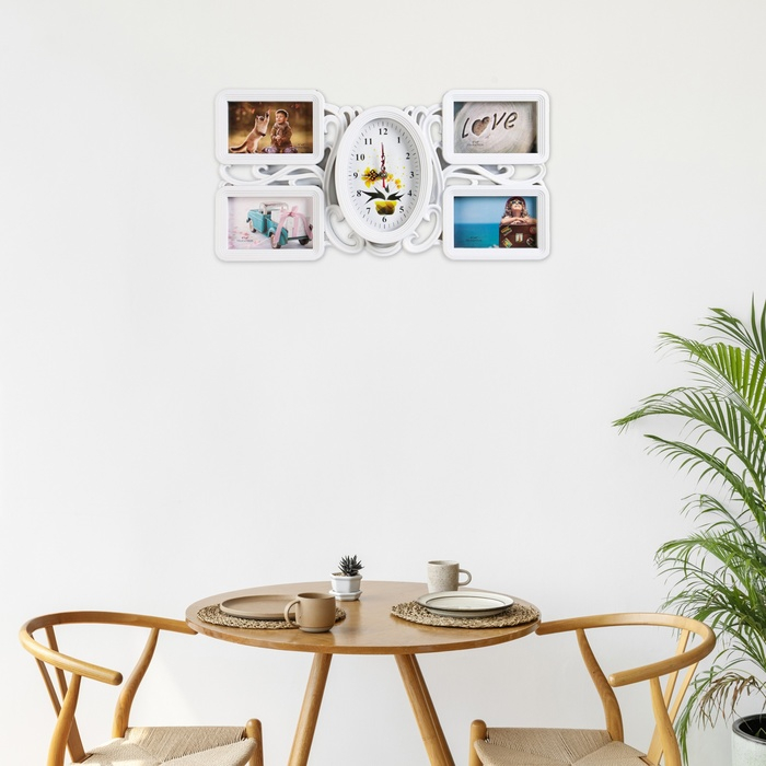 Настенные часы с фоторамками - оригинальный подарок, который никого не оставит равнодушным. Эти часы настоящая находка для тех, кто ценит качество и неповторимый дизайн. Настенные часы - это не только функциональный предмет, но и настоящий декоративный аксессуар, они разнообразят интерьер любой спальни или гостиной, подчеркнут стиль и гармонию вашего дома. Вместе с часами идут 4 рамки для фотографий, сделайте подборку из лучших и любимых фотографий, которые будут напоминать вам о каком-то приятном моменте вашей жизни.