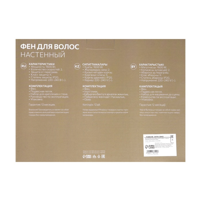 Компактный фен для волос LGE-005 с настенным креплением подойдёт для быстрой домашней укладки. С его помощью вы можете сделать естественную укладку без особых усилий, а оптимальная мощность устройства сократит время процесса.
