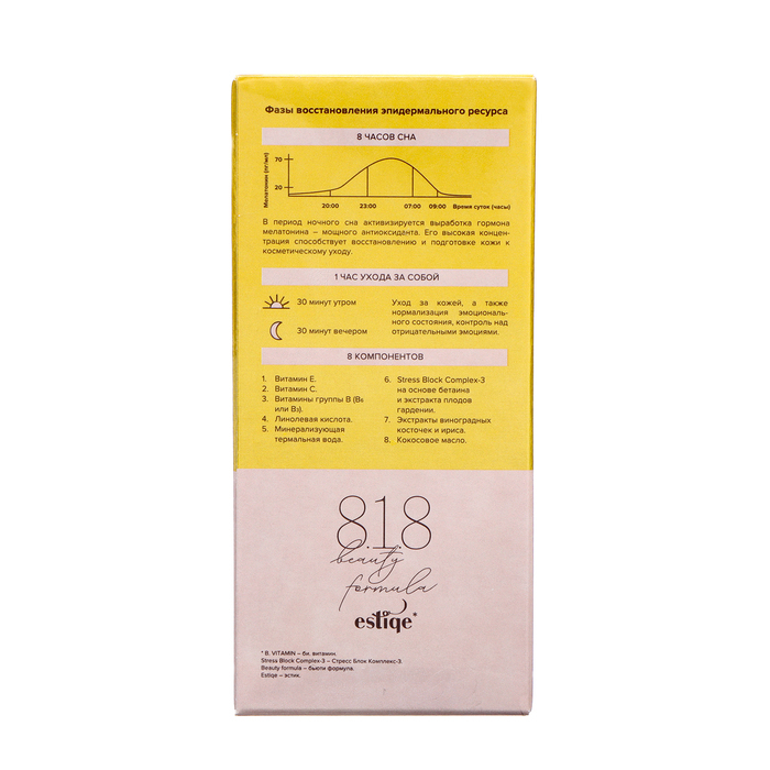 8.1.8 beauty formula - трехфазная система профилактики и защиты кожи от стресса. Создана для чувствительной кожи женщин мегаполиса, испытывающих дефицит сна и отдыха. Формула восстановления эпидермального ресурса и омоложения кожи: 8 часов сна + 1 час ухода за собой + 8 активных компонентов.