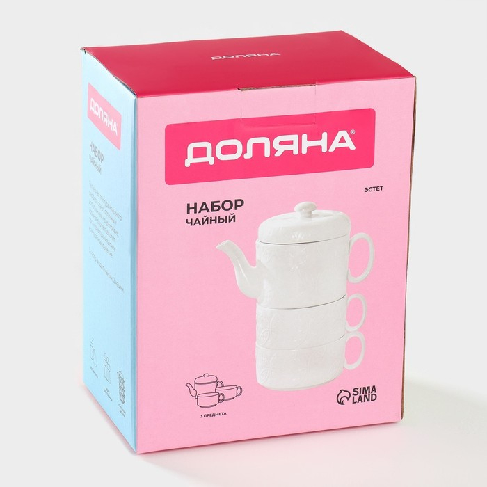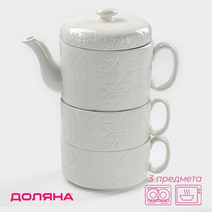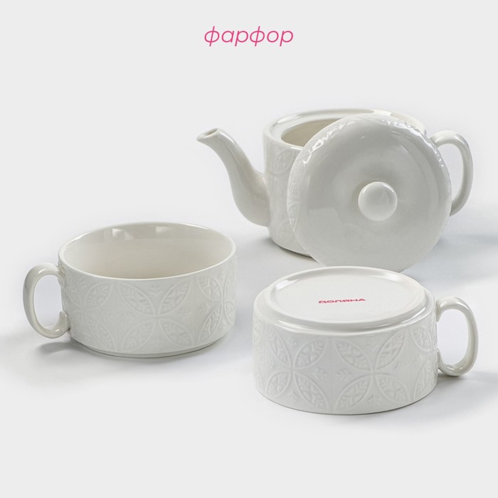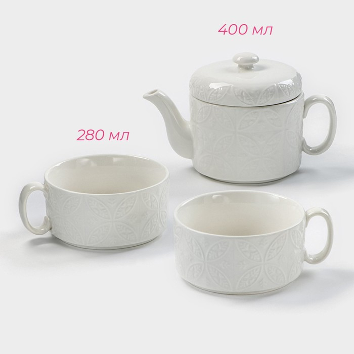 Набор фарфоровый чайный Доляна «Эстет. Орнамент», 3 предмета: чайник 400 мл, 2 кружки 280 мл, цвет белый