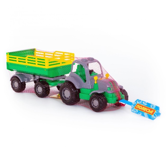 Трактор — это незаменимый вид техники на любой ферме. Он оснащён вместительным прицепом с широкими бортами для перевозки игрушек. Благодаря большим пластиковым колёсам игрушка подойдёт для развлечений дома и на улице.