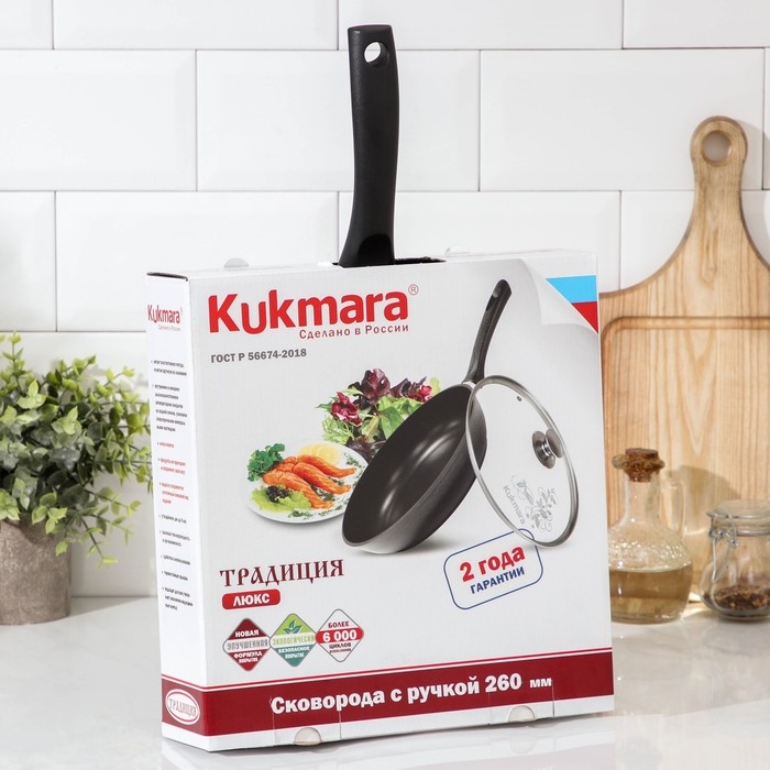 Продукция Kukmara изготовлена из литого алюминия и покрыта немецким высококачественным антипригарным покрытием на водной основе, усиленным сверхпрочными минеральными частицами.