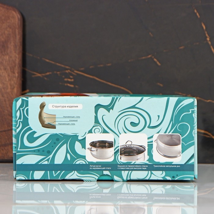 Изделие грушевидной формы прошло зеркальную наружную полировку и, без сомнения, станет предметом гордости домашнего или профессионального кулинара. Прутковые ручки прикреплены по технологии точечной сварки. Толщина стенок составляет 0,5 мм, дна — 2 мм. Термоаккумулирующее дно кастрюли, подходящей для любых видов плит, представляет собой многослойную конструкцию с алюминиевой пластиной. Благодаря такому строению ваше приобретение, в отличие от аналогов с монолитным дном, будет заметно лучше распределять тепло по рабочей поверхности.