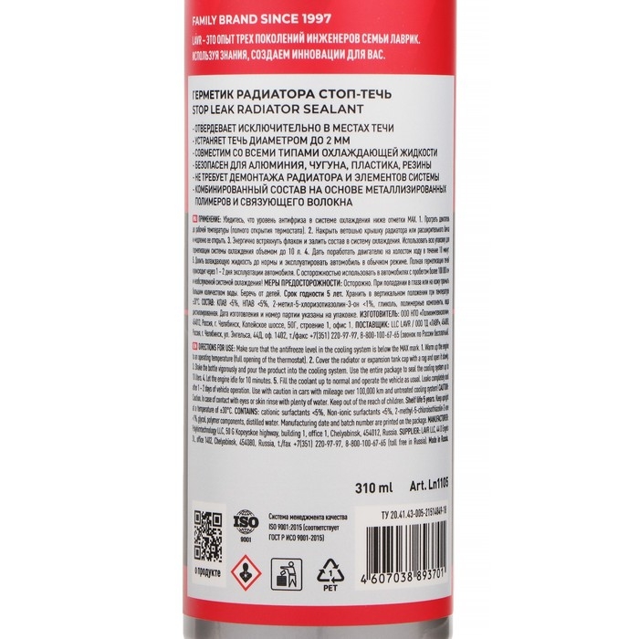 Полная герметизация течей происходит через 1-2 дня эксплуатации автомобиля в штатном режиме. Упаковки препарата достаточно для герметизации системы охлаждения объемом до 10 л. Для наилучшего эффекта перед использованием герметика рекомендуется промыть систему охлаждения препаратами LAVR.