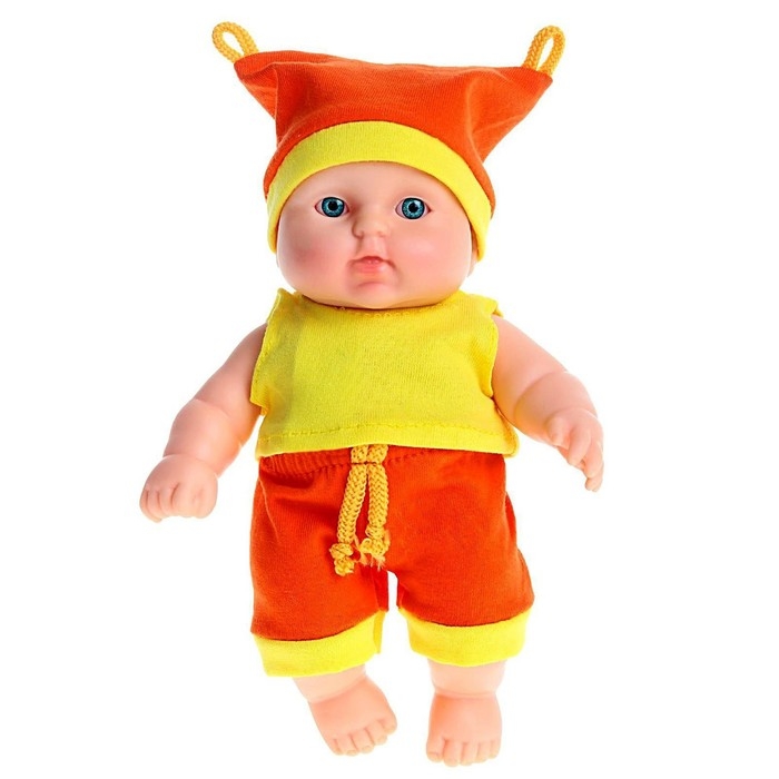 В комплект одежды куклы входит трикотажная безрукавая футболка, штанишки и шапочка. Все элементы одежды выполнены аккуратно и качественно, что позволит ребёнку легко переодевать куклу в разные наряды, разнообразить её образы и создавать разные ситуации в игре.