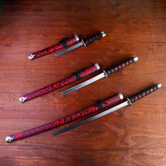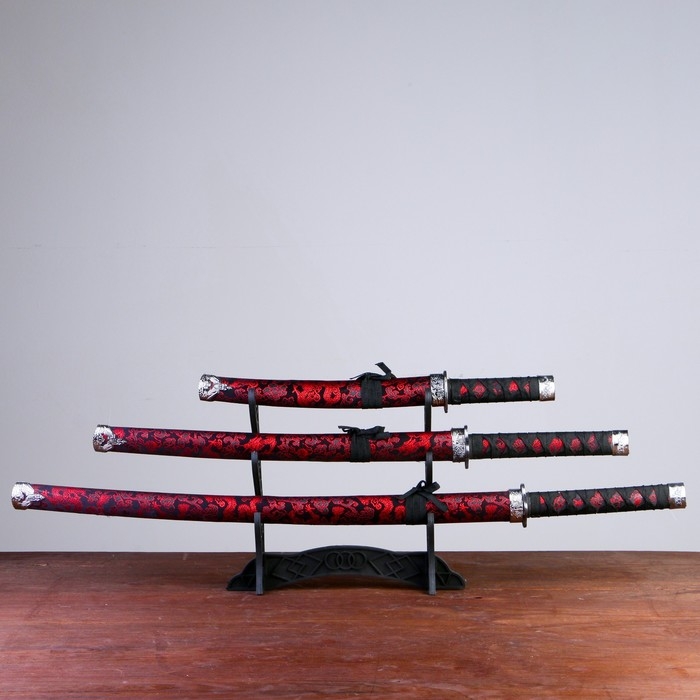 Сув. изделие катаны 3в1 на подставке, ножны ткань, драконы красные на черном 47/70/89см