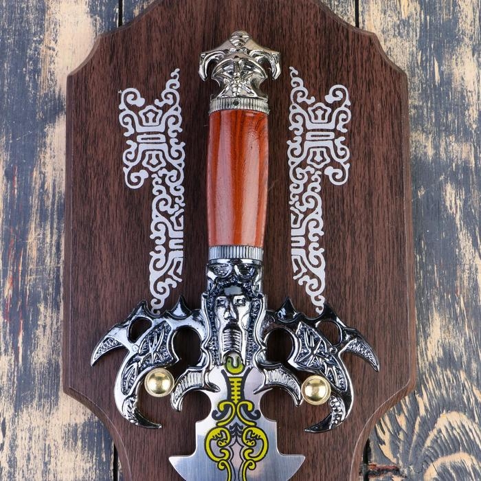 Сувенирный меч на планшете, клинок 27 см, рукоять с головой старца